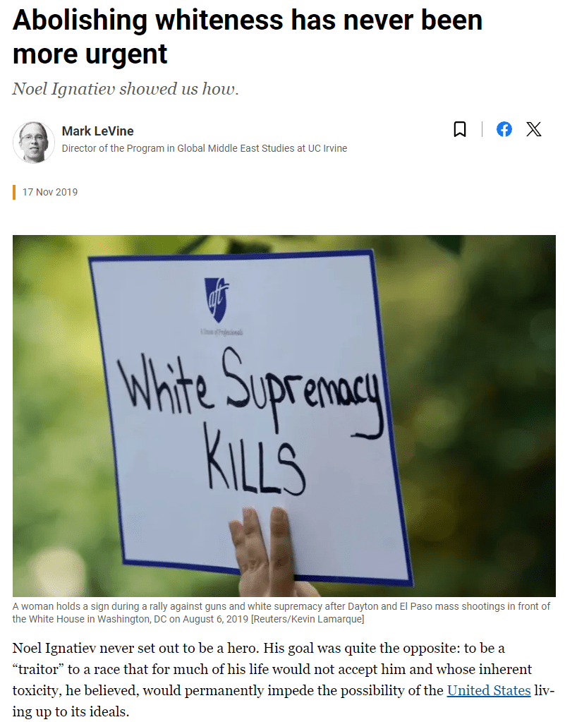 This screenshot of an Aljazeer headline articulates the Bolsheviks’ ultimate goal. “Abolishing whiteness has never been more urgent,” writes rabid, genocidal justifying jew Mark LeVine, American-born professor, writer, and Aljazeera contributor.